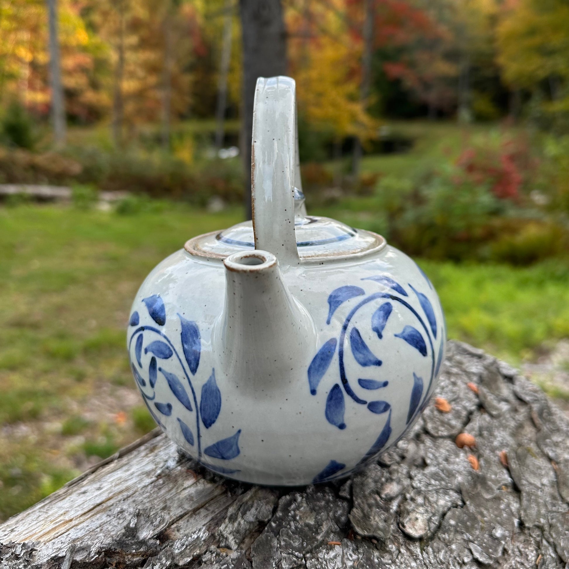 This durable stoneware teapot is made with hardwearing zircon glaze. Hand-thrown and decorated with cobalt vine brushwork. The pulled handle over the top of the teapot provides extra control when pouring.