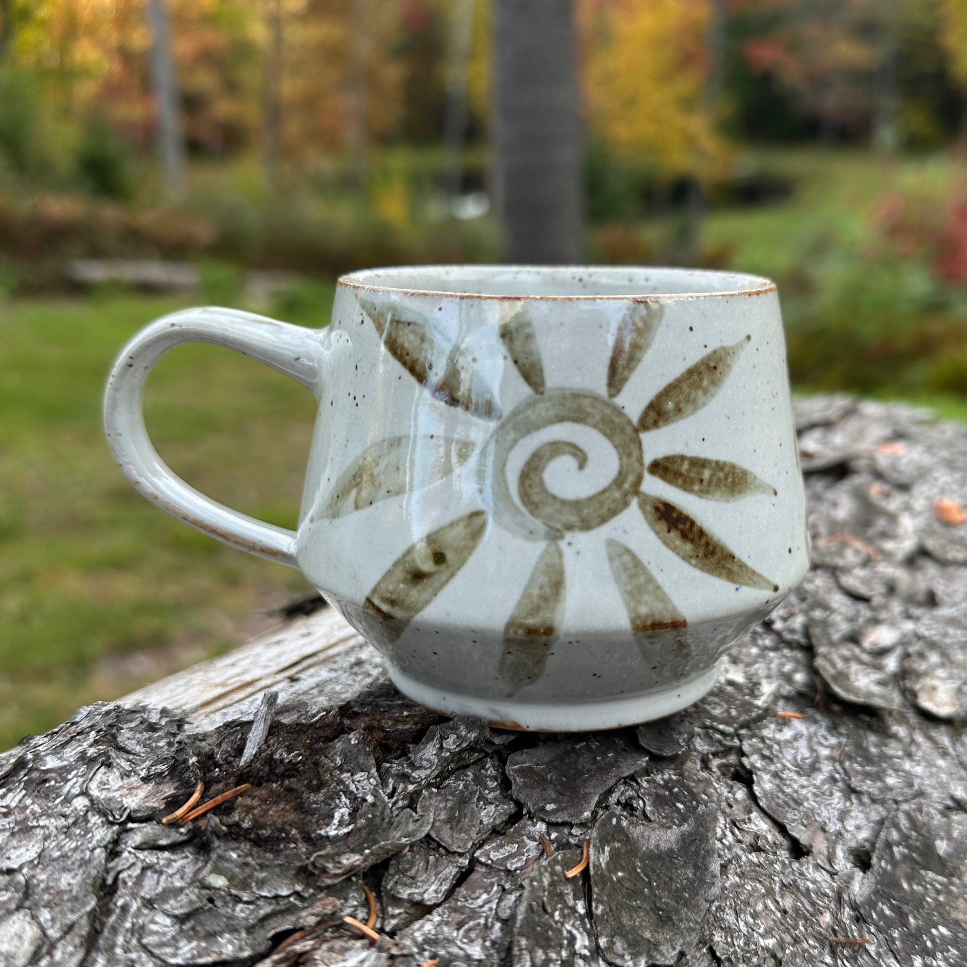 White speckled mug with iron brushwork decoration. Hand-thrown from durable brown stoneware with glossy zircon glaze. Reduction fired to cone 10.