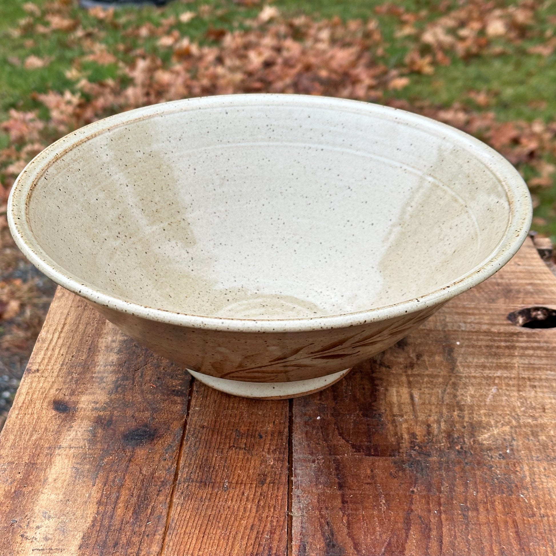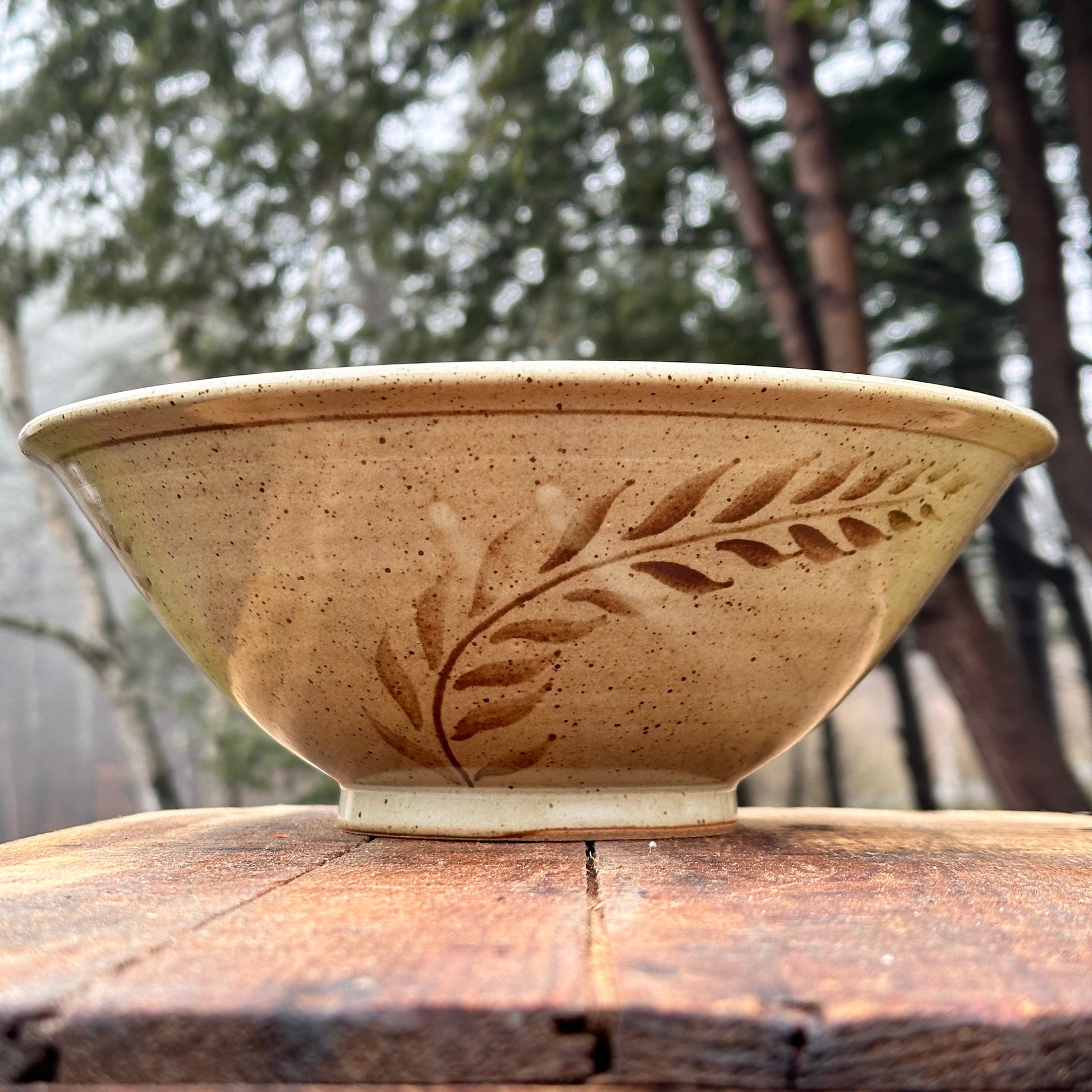 Stoneware bowl decorated with hard-wearing soft green zircon glaze and iron brushwork foliage.