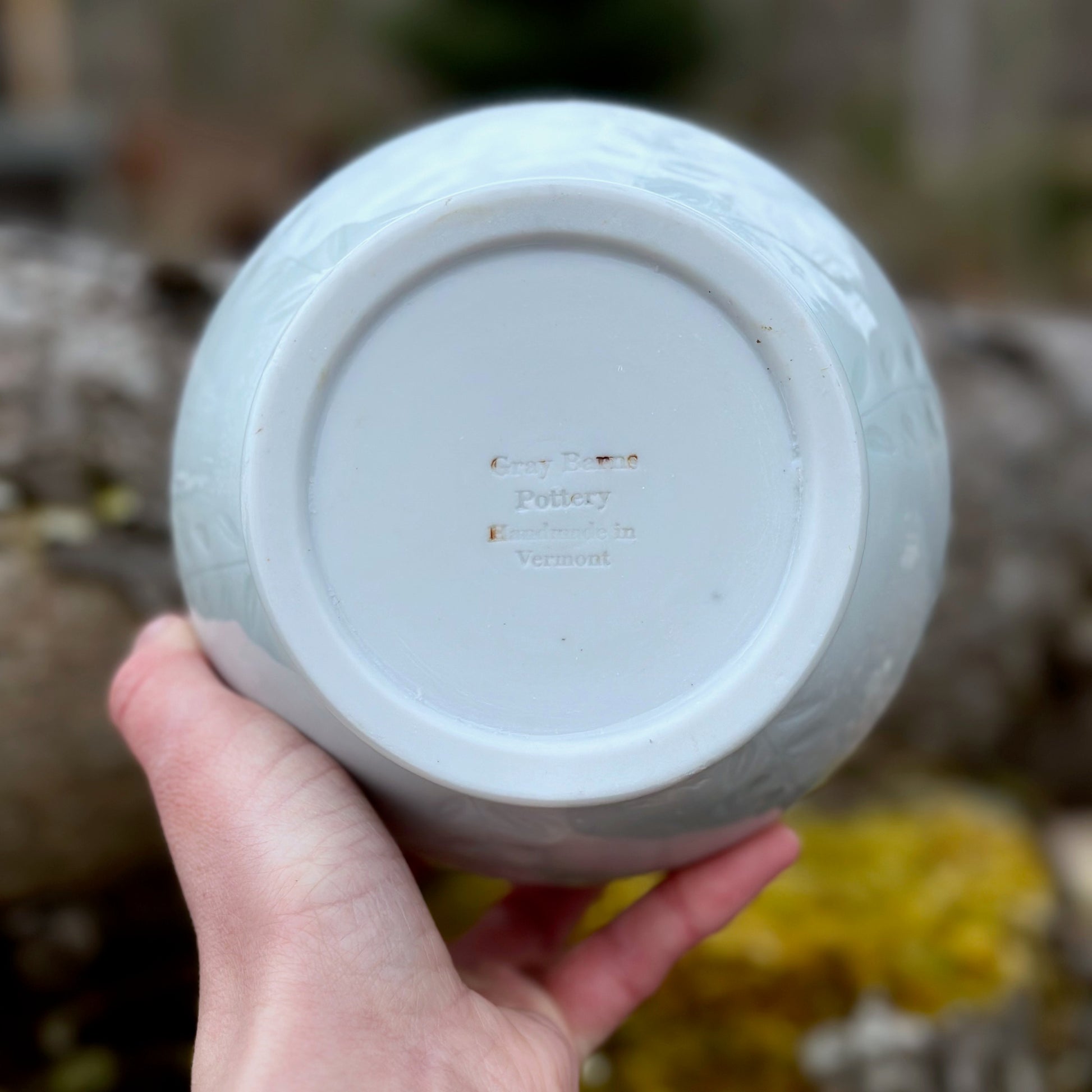 Hand-thrown from translucent porcelain with light blue glaze and carved vine decoration.