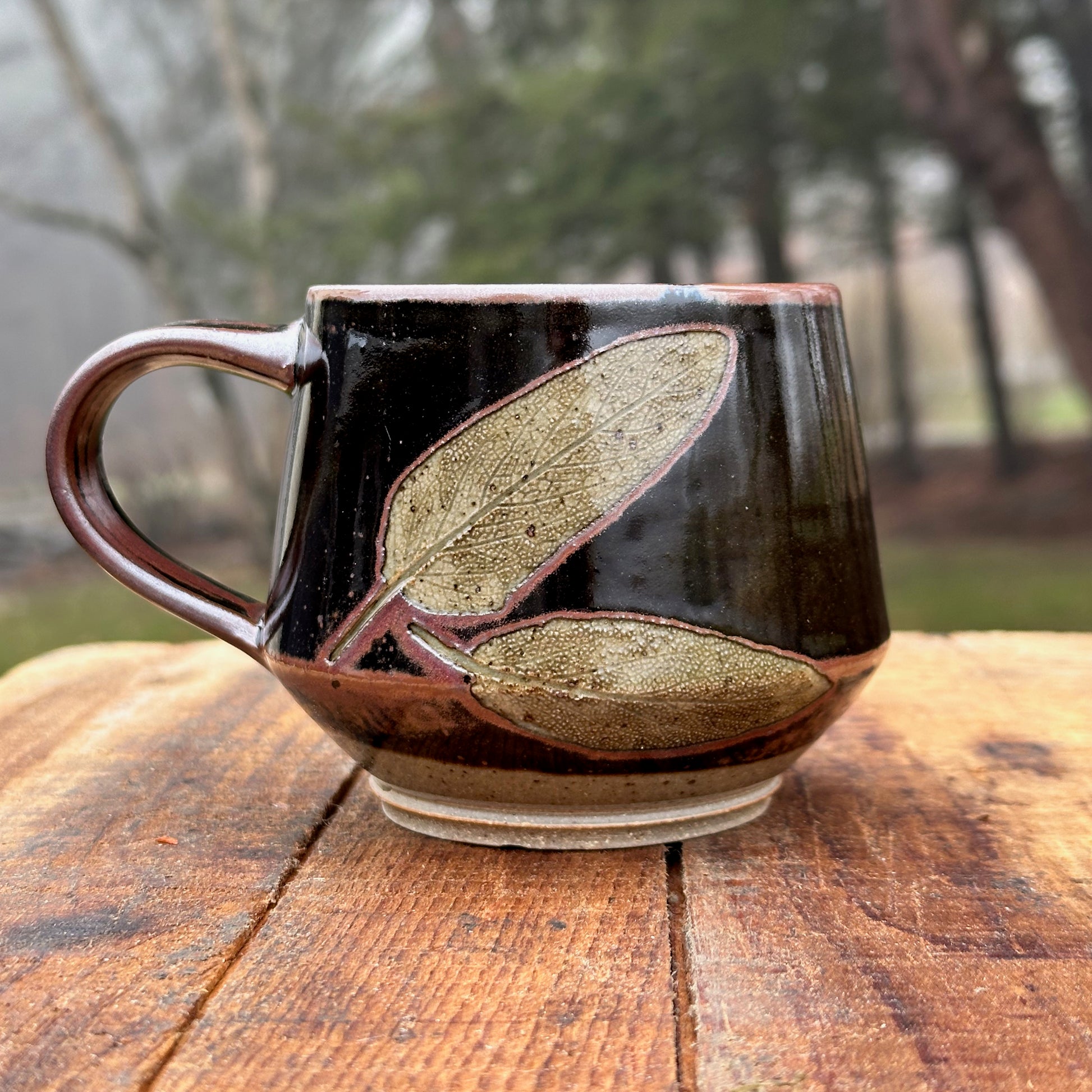 Black slipware mug decorated with a real sage leaf and green celadon glaze.